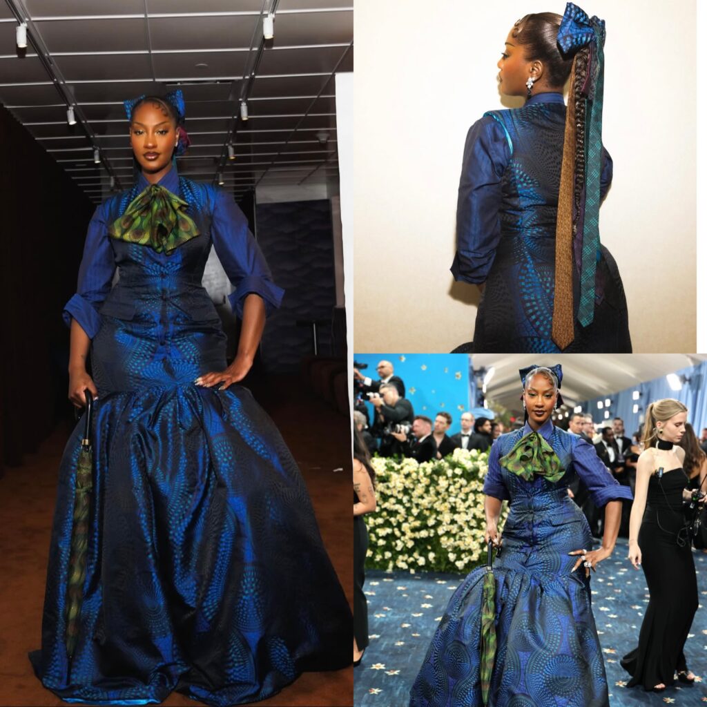 Tems, styled in a custom Ankara indigo shirt dress by Ozwald Boateng, detailed with subtle green patterns. The look, complete with a bow tie, headpiece, and umbrella, echoed Boateng’s 2019 womenswear debut at the Apollo Theater, a celebration of Harlem Renaissance glamour and timeless Black sophistication.